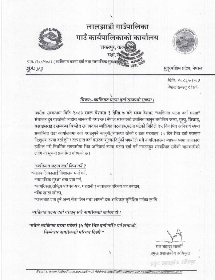 व्यक्तिगत घटना दर्ता सम्बन्धी सूचना ।