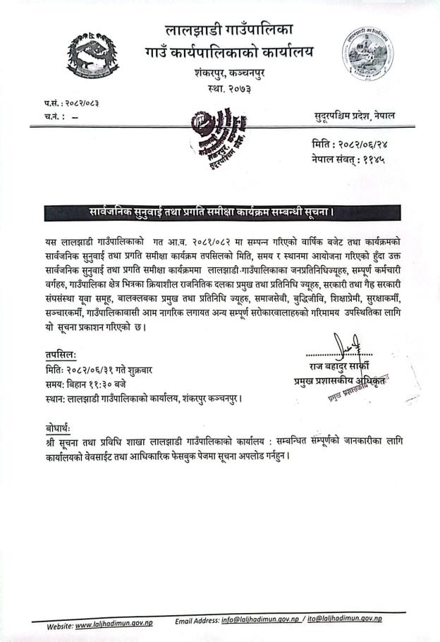 सार्वजनिक सुनुवाई तथा प्रगति समिक्षा कार्यक्रम सम्बन्धी सूचना ।