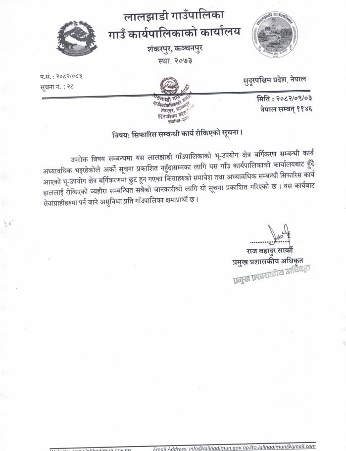 » सिफारिस सम्बन्धी कार्य रोकिएको सूचना ।