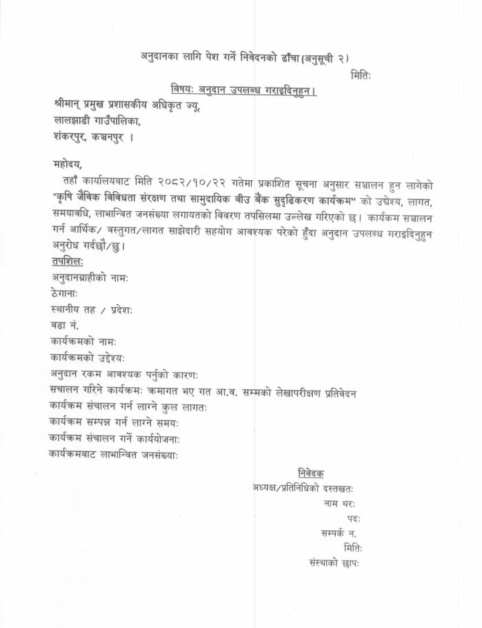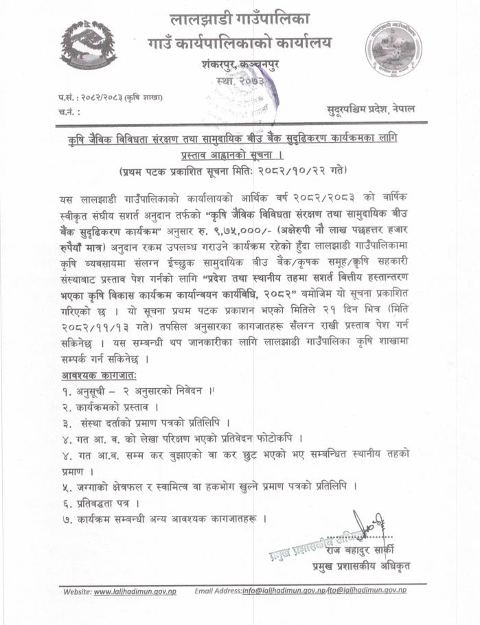 » कृषि जैविक विविधता संरक्षण तथा सामुदायिक बीउ बैंक सुदृढिकरण कार्यक्रमका लागि प्रस्ताव आह्वानको सूचना ।
