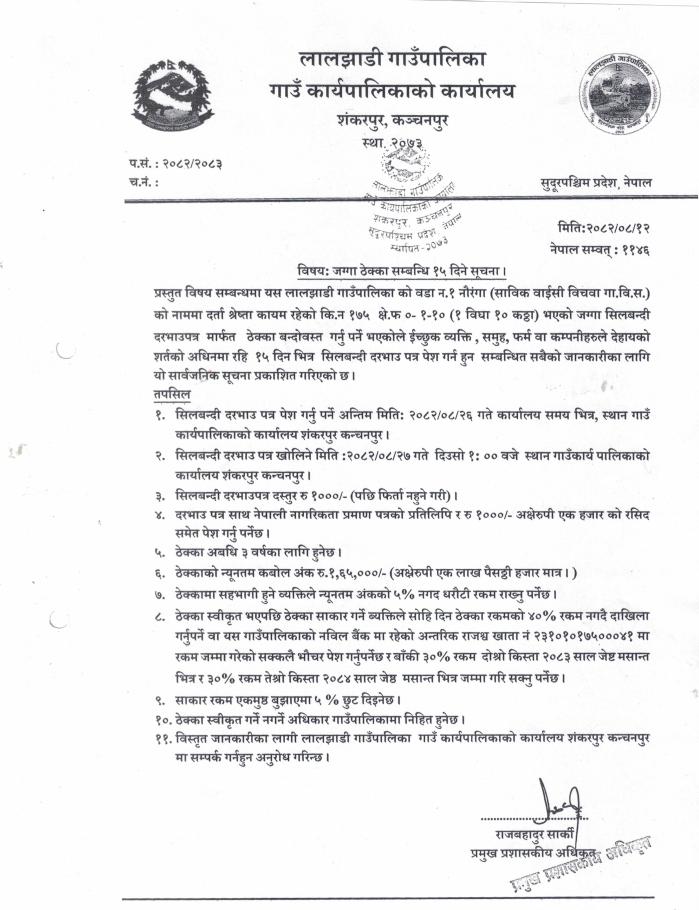 जग्गा ठेक्का सम्बन्धी १५ दिने सूचना ।