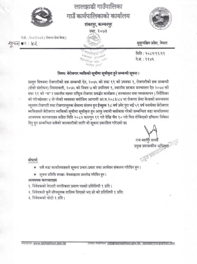 बेरोजगार व्यक्तिको सूचीमा सूचीकृत हुने सम्बन्धी सूचना ।